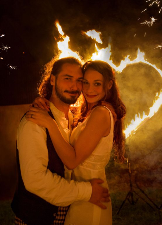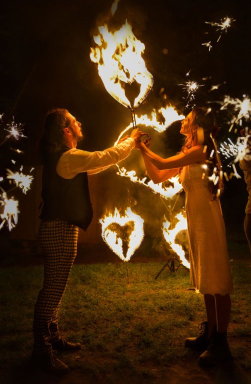 Po setmění tuto netradiční svatbu v krásné přírodě u polských hranic ozvláštnili naši ohniví umělci krátkým vystoupením, do kterého zapojili všechny zúčastněné. Hostům jsme rozdali prskavky, které v závěru show zapálili, zatím co novomanželé společně prošli k ohnivému srdci, které symbolicky zapálili právě v den, kdy se rozhodli stvrdit plameny své lásky manželským slibem.