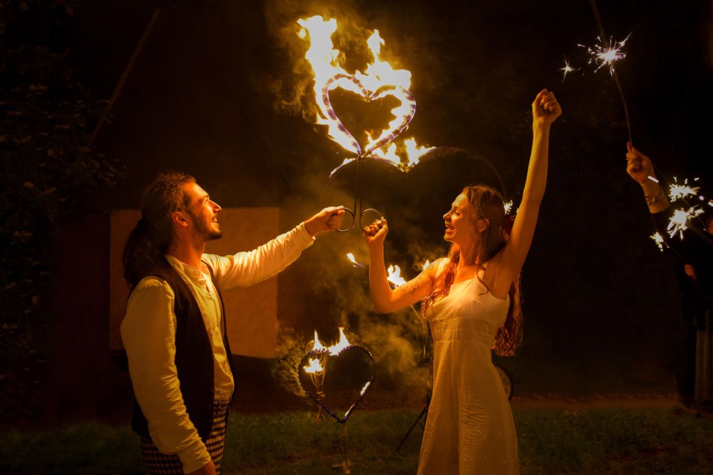 Ohnivé srdce se znovu rozhořelo na další z krásných svateb letošního roku. Tentokrát naši umělci předvedli krátkou ohnivou show, do které zapojili hosty i novomanželský pár.