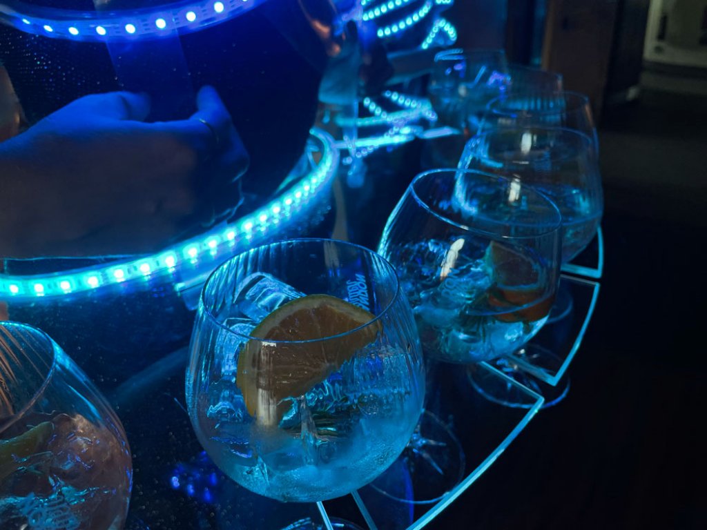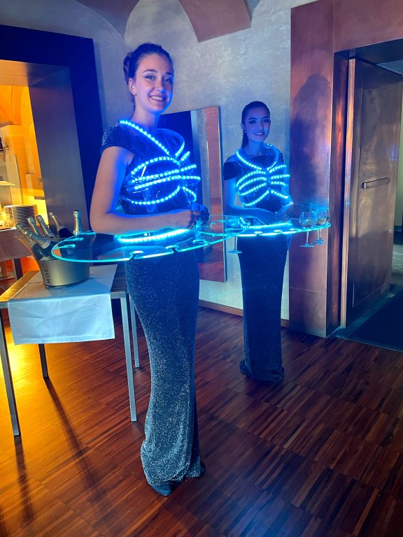 Výzvou pro nás bylo především upravit naší rockovou ohnivou show tak, aby se vešla do stísněných prostorů. Svítící hostesky jsme přebarvili do barev restaurace, stejně jako stoly pro welcome drink.