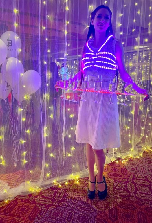 Pro společnost Benefit na jejich skvělou a nespoutanou párty, kam přicestoval i slovenský Rytmus jsme dodali svítící hostesky v černých a bílých šatech. Kromě rozdávání welcome drinků z podsvícených stolů měly za úkol i rozproudit atmosféru a bavit hosty.